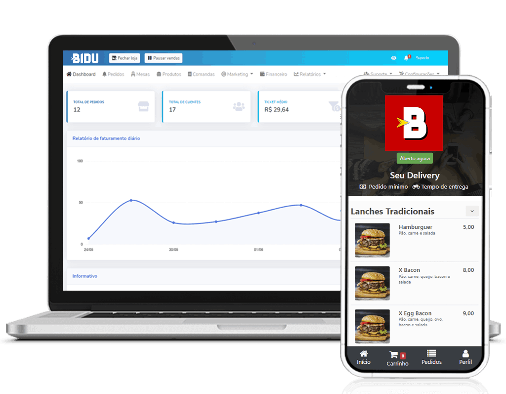 Nosso sistema é um aplicativo web totalmente responsivo e não possui necessidade de instalação por parte dos clientes. Dessa forma, apenas divulgando o seu link nas redes sociais, o seu cliente poderá visualizar seu menu e fazer o pedido pelo smartphone ou computador com muita comodidade.